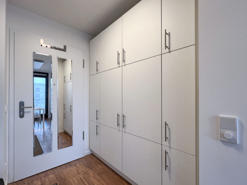 Platz für Ihre Kleidung bietet der eingepasste Einbauschrank gegenüber der Küchenzeile.