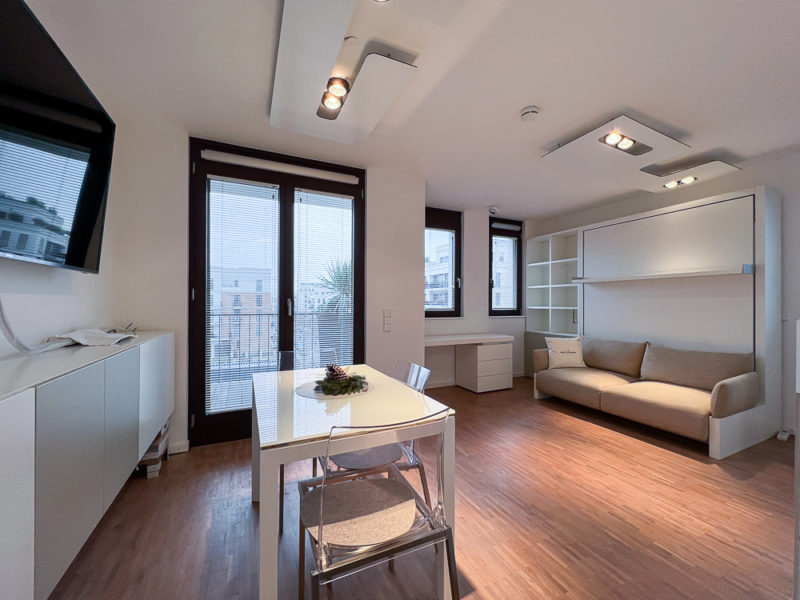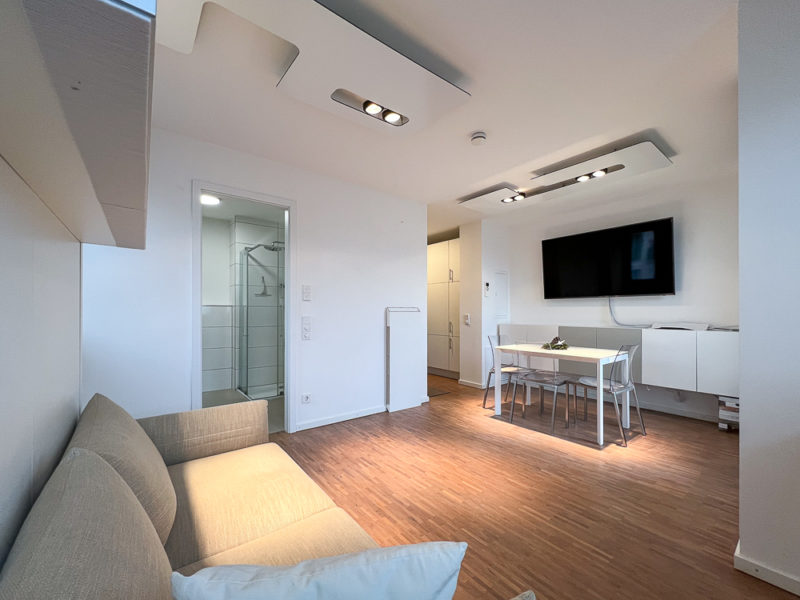 Im Wohnbereich steht Ihnen ein Arbeitsplatz, ein Esstisch, ein Hängesideboard und ein riesiger Flat-TV zur Verfügung. Das Bett lässt sich, ganz im New York Style, wo smarte Möbel eine extreme Bedeutung haben, am Abend herunterklappen.