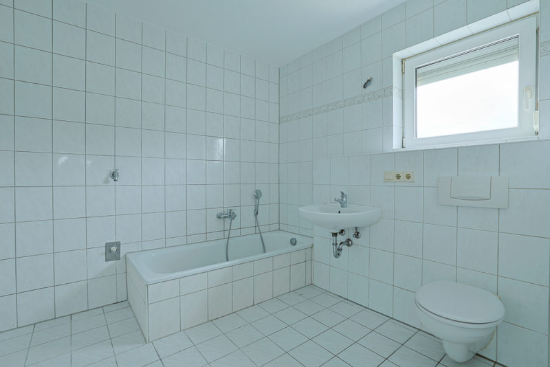 Das Tageslichtbad ist zeitlos raumhoch gefliest und mit einer Badewanne ausgestattet. Ein praktischer Waschmaschinenanschluss im Bad erspart Ihnen den Weg in einen Gemeinschaftswaschraum. Ein separater Abstellraum im Flur mit platzsparender Falttür bietet zusätzlichen Stauraum.