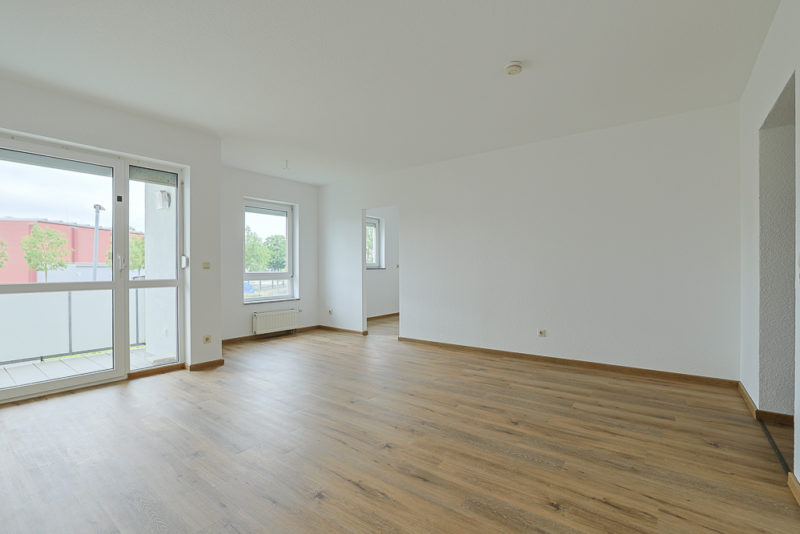Vom zentral gelegenen Flur aus erreichen Sie alle Räume. Das großzügige, ca. 23,5 m² große Wohnzimmer ist lichtdurchflutet und öffnet sich direkt auf den ca. 6 m² großen Balkon – der perfekte Ort, um entspannte Stunden im Freien zu genießen. Die Küche ist clever positioniert und grenzt direkt an den Wohnbereich an, was kurze Wege garantiert und für ein offenes Wohngefühl sorgt.