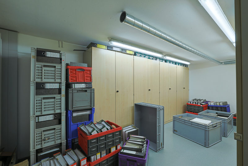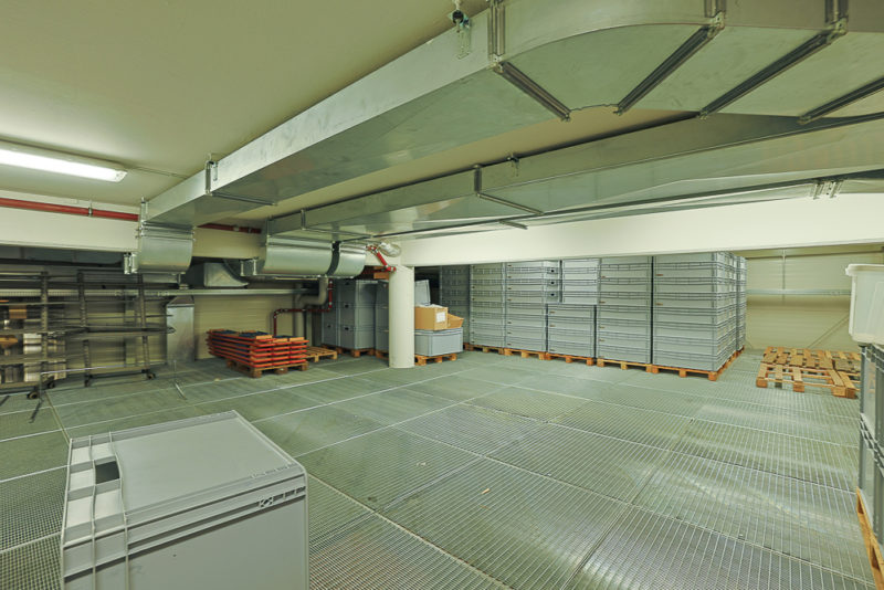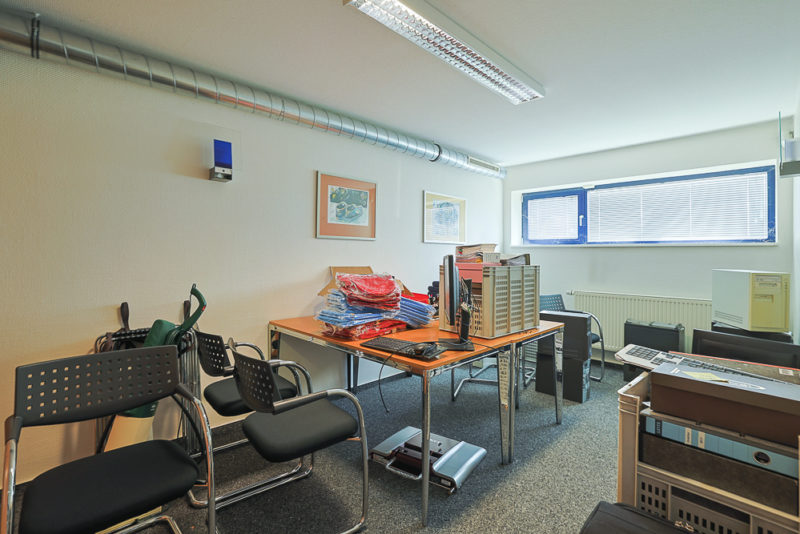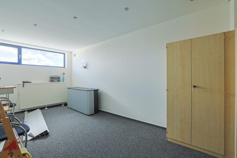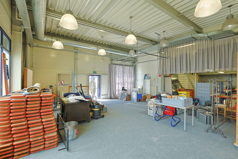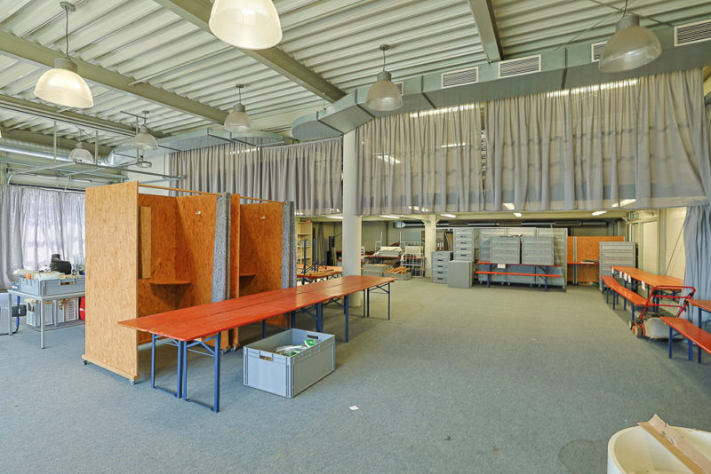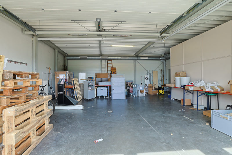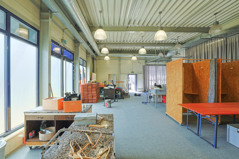 Haupthalle mit Rolltor und großen Fensterfronten. Im hinteren Bereich wurde eine zweite Ebene eingezogen, um die Halle doppelstöckig zu nutzen. Diese Ebene kann leicht entfernt werden. WC, Treppenhaus zum Heizungs- und Technikraum und Büro in der oberen Etage.
